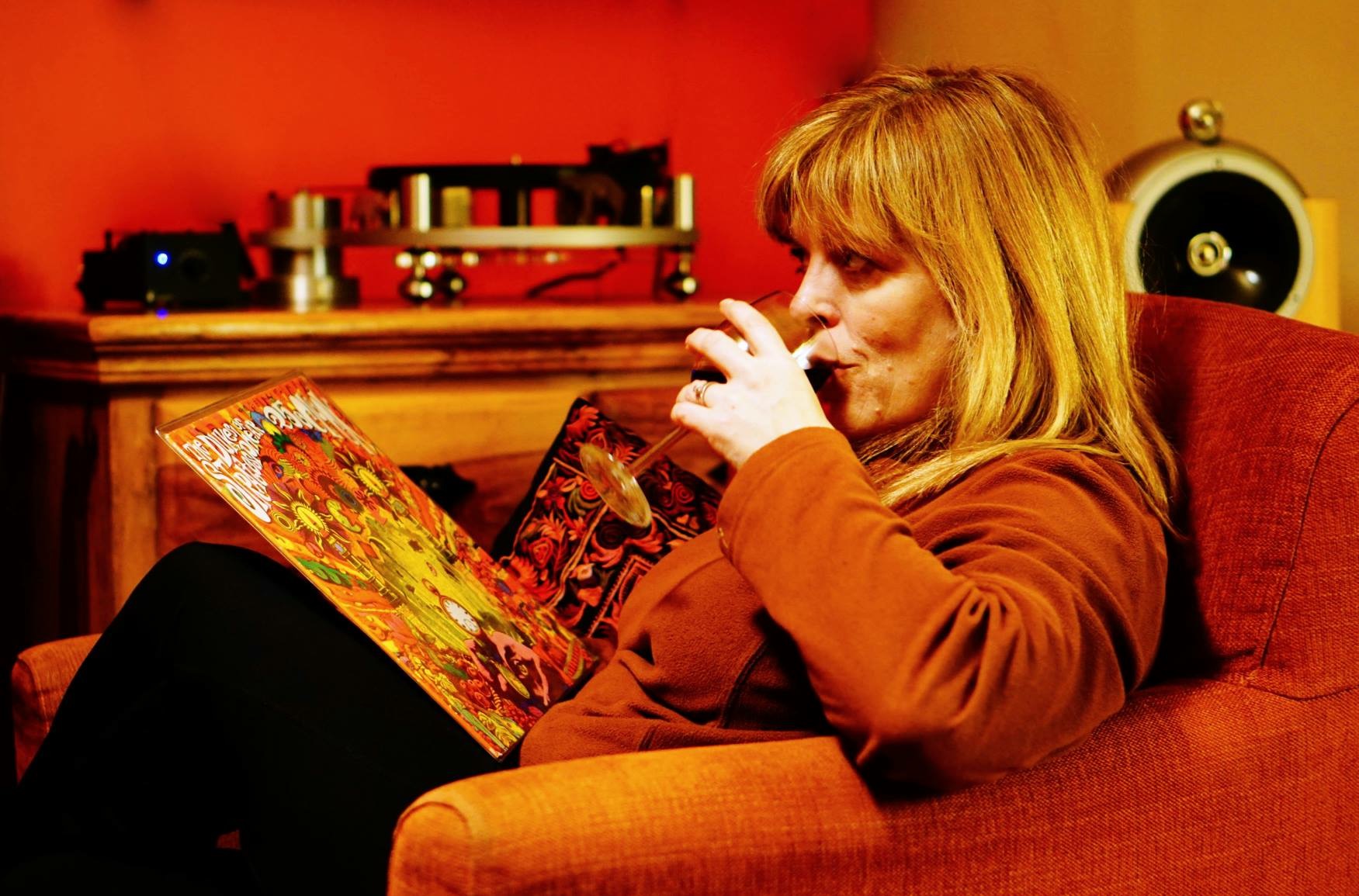 Linda enjoying the luxury of a comfy chair and a house full of records